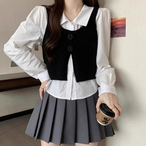 키체샵 남친 니트 이너 투피스 봄가을 솔리드 긴팔 트렌드 셔츠 가짜 HO3