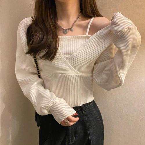[미라클세븐]여성 오프숄더 끈 나시 긴팔 골지 니트 소매 버튼