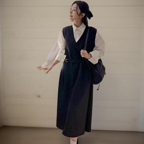 [옷자락] 여성 심플 버클 벨티드 모직 니트 민소매 롱 원피스