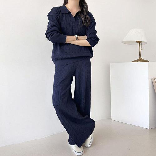 [문에이블]문에이블 여자 여성 봄 가을 간절기 루즈핏 케이블 꽈배기 카라넥 니트 밴딩 팬츠 투피스 세트