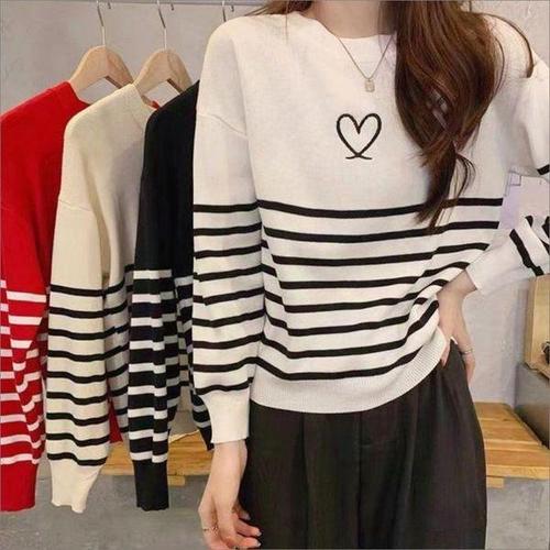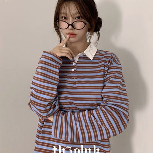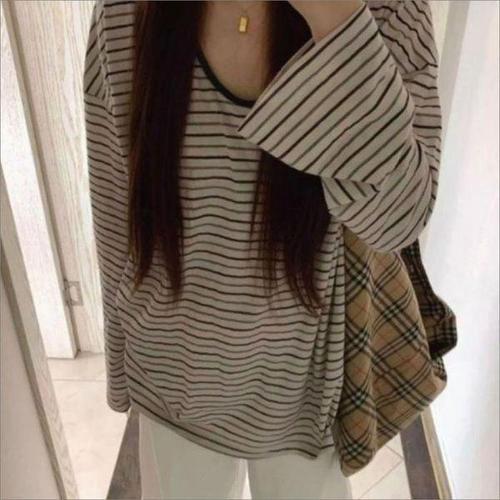 [셀러허브_여성트랜드패션]여자 캐주얼 루즈핏 긴팔티 단가라 배색 데일리 티셔츠