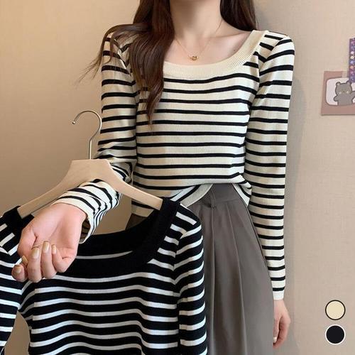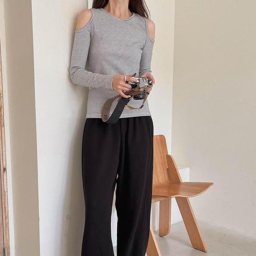 [다잇템]여자 캐쥬얼 줄무늬 U넥 어깨트임 긴팔티 (10729175A)