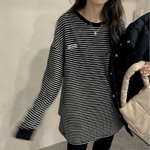 데일리앤 더스트 여성 루즈핏 자수 레터링 긴팔 맨투맨 기본 면 스트라이프 티셔츠 봄