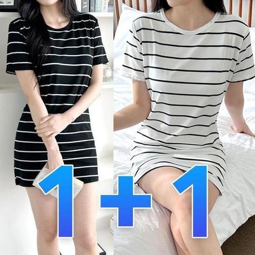 미중 여성 뉴 반팔 면 캐주얼 스트라이프 라운드넥 박시 심플 홈 외출용 롱원피스rll