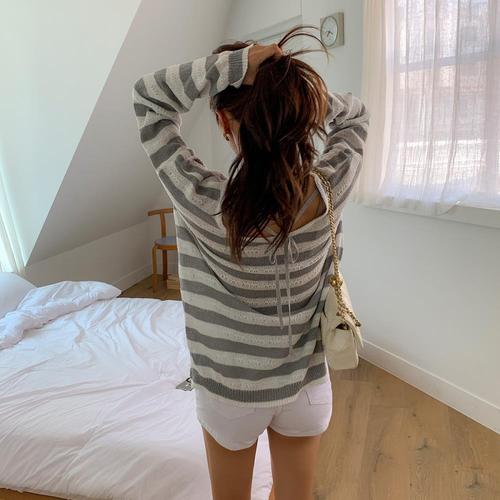 [미라클세븐]여성 면혼합 스트라이프 백스트랩 루즈핏 긴팔 니트