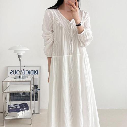 [다잇템]여자 벌룬 단가라 코튼 단추 브이 SS 롱원피스 (45899629)