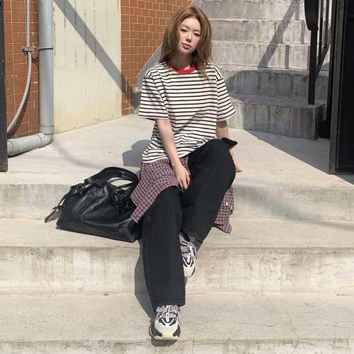 [옷자락] 여자 캐주얼 스트라이프 오버핏 반팔티 상의
