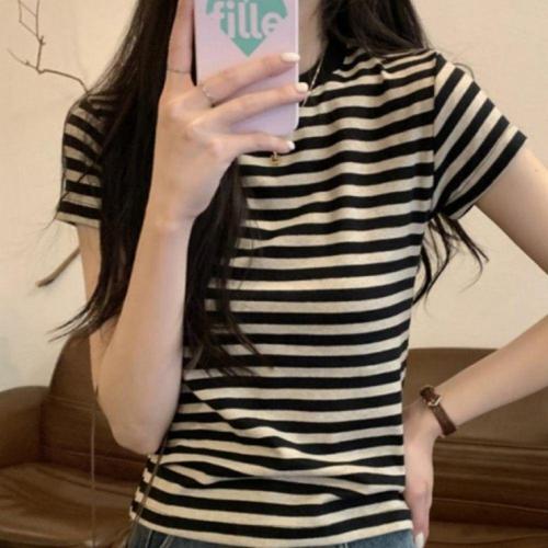 [오너클랜]인기상품 여성용 스트라이프 크롭 반팔티 배색 라운드넥 여름 반팔 나시 [WFLL9Q9_260304]
