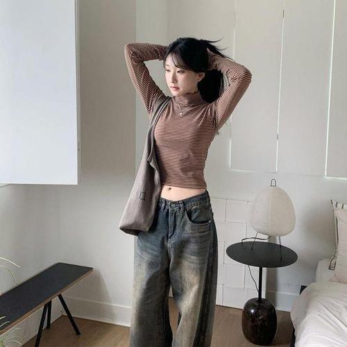 [옷자락] 여자 폴리 스판 스트라이프 폴라넥 크롭 긴팔티