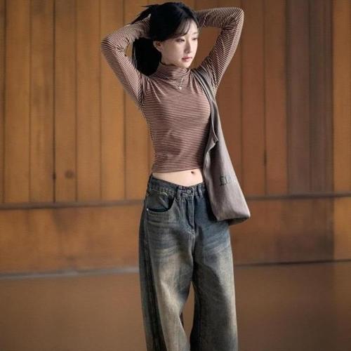 여성 캐주얼 라운드 스트라이프 긴팔 티셔츠 슬림 크롭 언발 티셔츠 이너티 간절기
