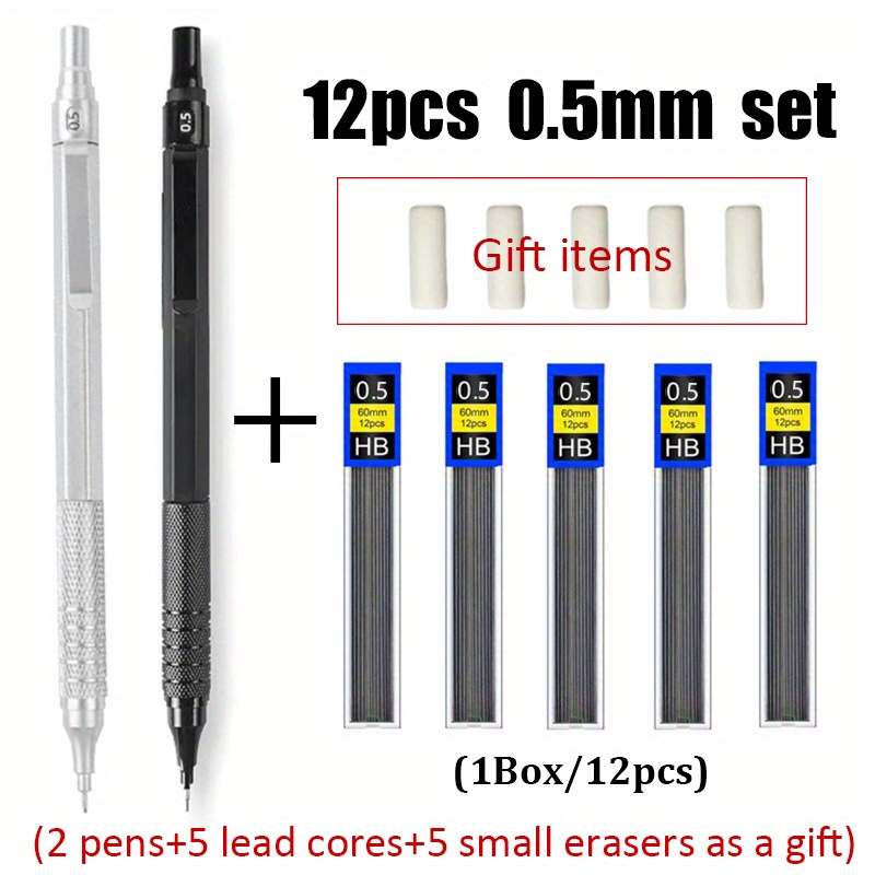 TEMU 고품질 신제품 기계식 금속 저중심 흑색 자동 연필 세트 12개입, 0.3/0.5/0.7/0.9mm 블랙 HB 그라파이트 교체용 심 포함, 사무용 필기구 (펜 2개 + 선물용 지우개 5개), 사무용 문구류