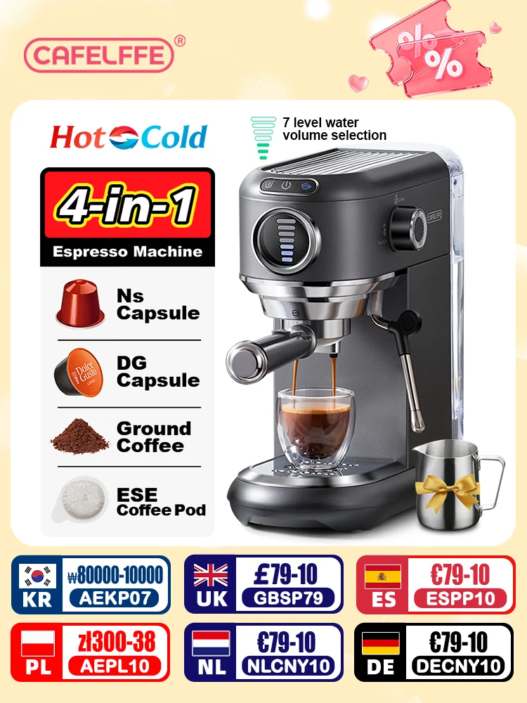 Cafelffe 4in 1 카페테라 카푸치노 커피 머신, 돌체 구스토 네스 캡슐 에스프레소 메이커 ESE 포드 지상 선물, 연인, 아빠, 엄마용 핫/콜드 추출 커피, 19바 고압 추출, 7단계 물량 선택.