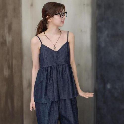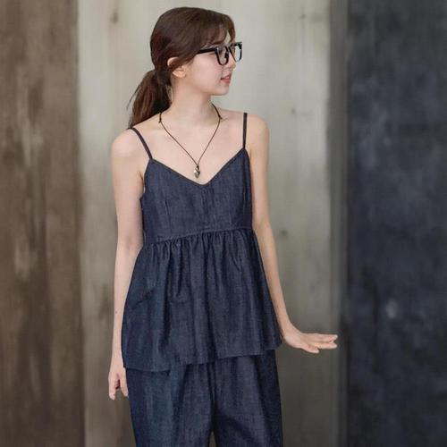 [신상오픈런]여성 키치 스타일 코튼 데님 스트랩 캉캉 나시 블라우스