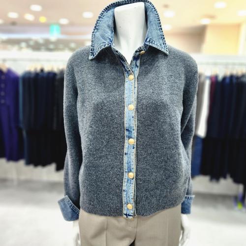[MAXZA] 워싱 데님 셔츠 카라 블록 니트 가디건