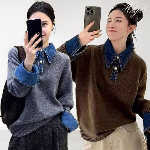 여성 데님 패치 니트 가디건 배색 디자인 청자켓 아우터 포켓 심플 캐주얼 점퍼