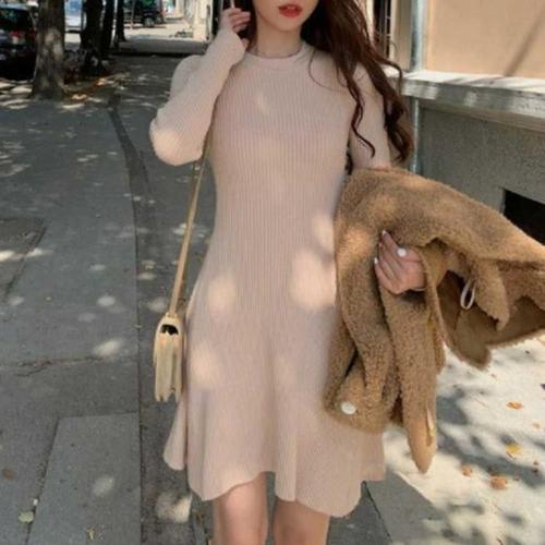 cammello 브이넥 슬림핏 골지 플레어 미니원피스 긴팔 A라인 드레스 하객룩