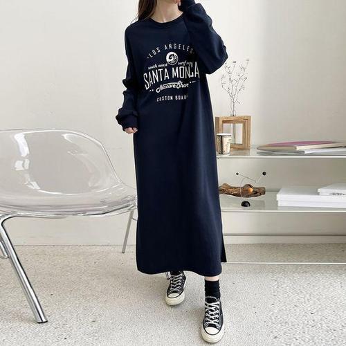 [유야]기모 레터링 긴팔 트임 롱 원피스 데일리 캐주얼 -OP0204H- 빅사이즈 루즈핏 여성 겨울