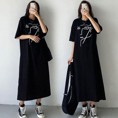[모노무드]LMO 여자 데일리룩 페이스그래픽 크루넥 숏슬리브 원피스룩