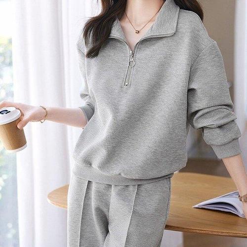 [문에이블]문에이블 여자 여성 가을 봄 루즈핏 니트 반집업 후드 밴딩 팬츠 데일리 투피스 상하의 세트