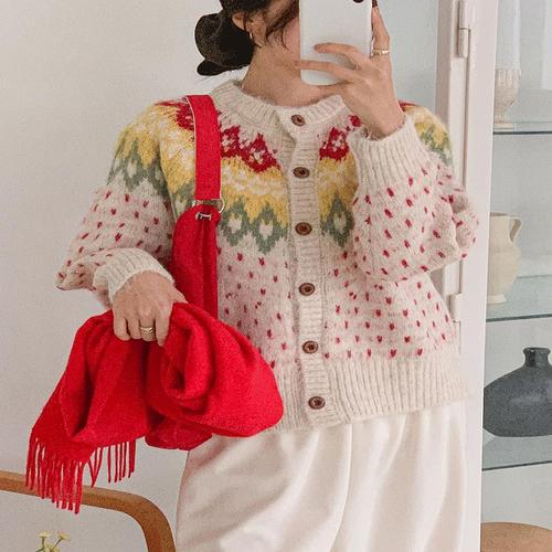 [퍼니걸스]라운드 울 도톰 아가일 긴팔 니트 가디건 9011 여성의류
