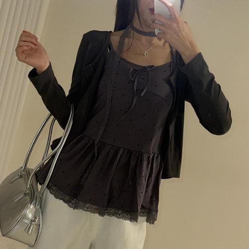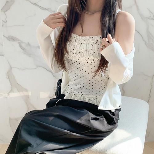 |CHD290D|여성용 봄 여름 간절기 프릴 도트 끈 나시와 가디건 세트