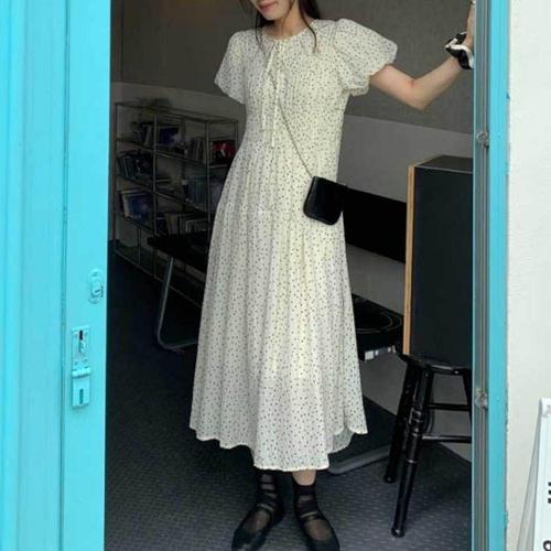 [다잇템]여자 여름 도트 땡땡이 패턴 반팔 롱원피스