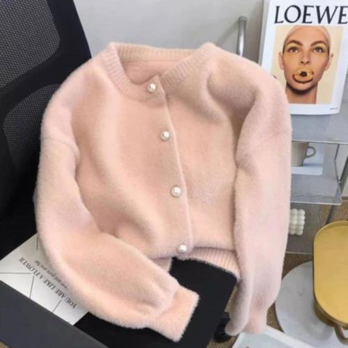 [신상오픈런]여성 루즈핏 두꺼운 퍼 진주 단추 라운드넥 니트 가디건 (46120383)