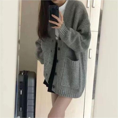 Rakumin 여성 루즈핏 브이넥 도톰 니트가디건