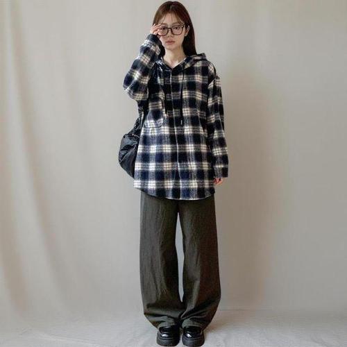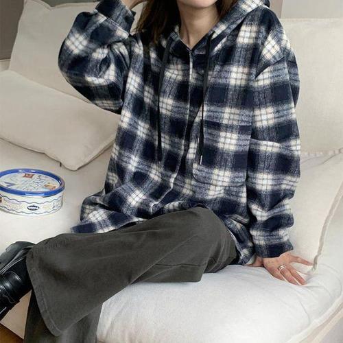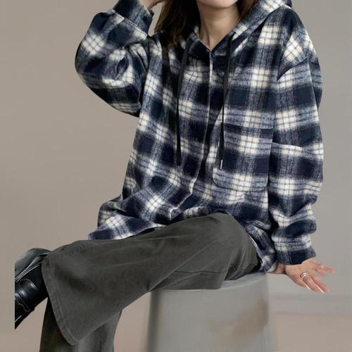 [옷자락]여성 일상용 면혼합 대형 체크 두꺼운 후드 셔츠
