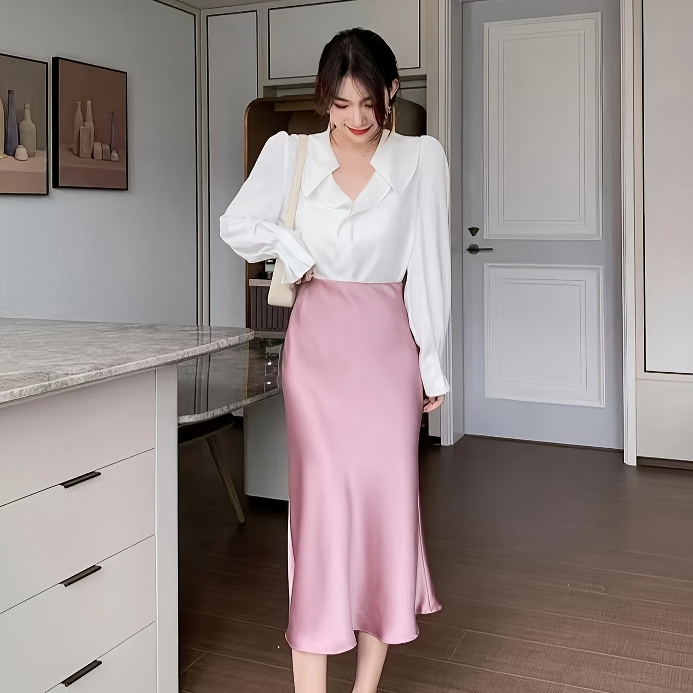 TEMU 여성용 우아한 새틴 머메이드 스커트 - 소프트 핑크 솔리드 컬러, 사계절 활용 가능한 캐주얼 & 포멀 착용, 맞춤형 디자인, 여성용 옷장 필수품, 교회용 스커트, 긴 스커트