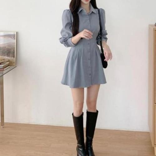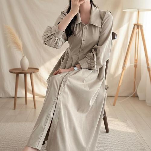 [다잇템]여성 롱 단추 SS 들러리룩 카라넥 핀턱 드레스