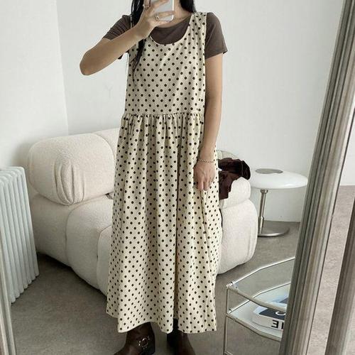 샵앤) 여성 민소매 도트끈 3단 루즈핏 땡땡이 끈나시 롱 원피스 NTT-WDR-20585-블랙