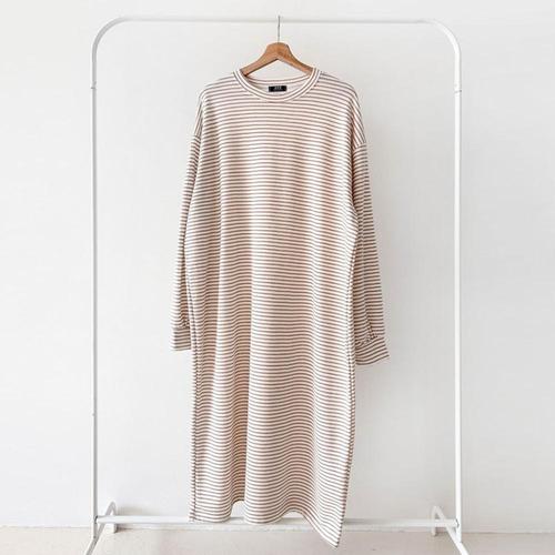 [샵앤][샵앤] 국산 여성 라운드 밑단 줄배색 박스 롱원피스 ARA-WDR-4948-진베이지