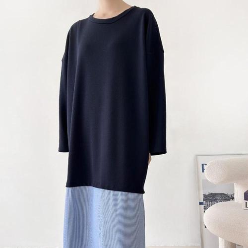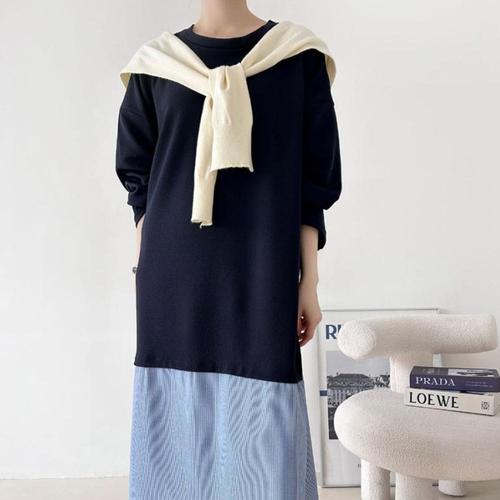 [샵앤][샵앤] 국산 여성 라운드 밑단 줄배색 박스 롱원피스 ARA-WDR-4948-네이비