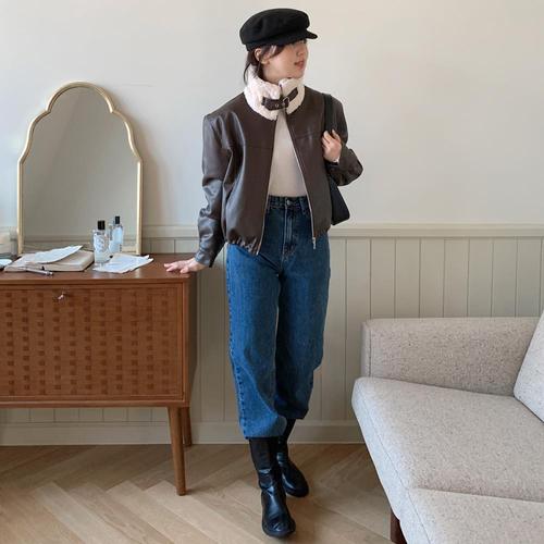 [VY] 여자 버클 빅사이즈 폴라넥 가죽 퍼 짧은 자켓