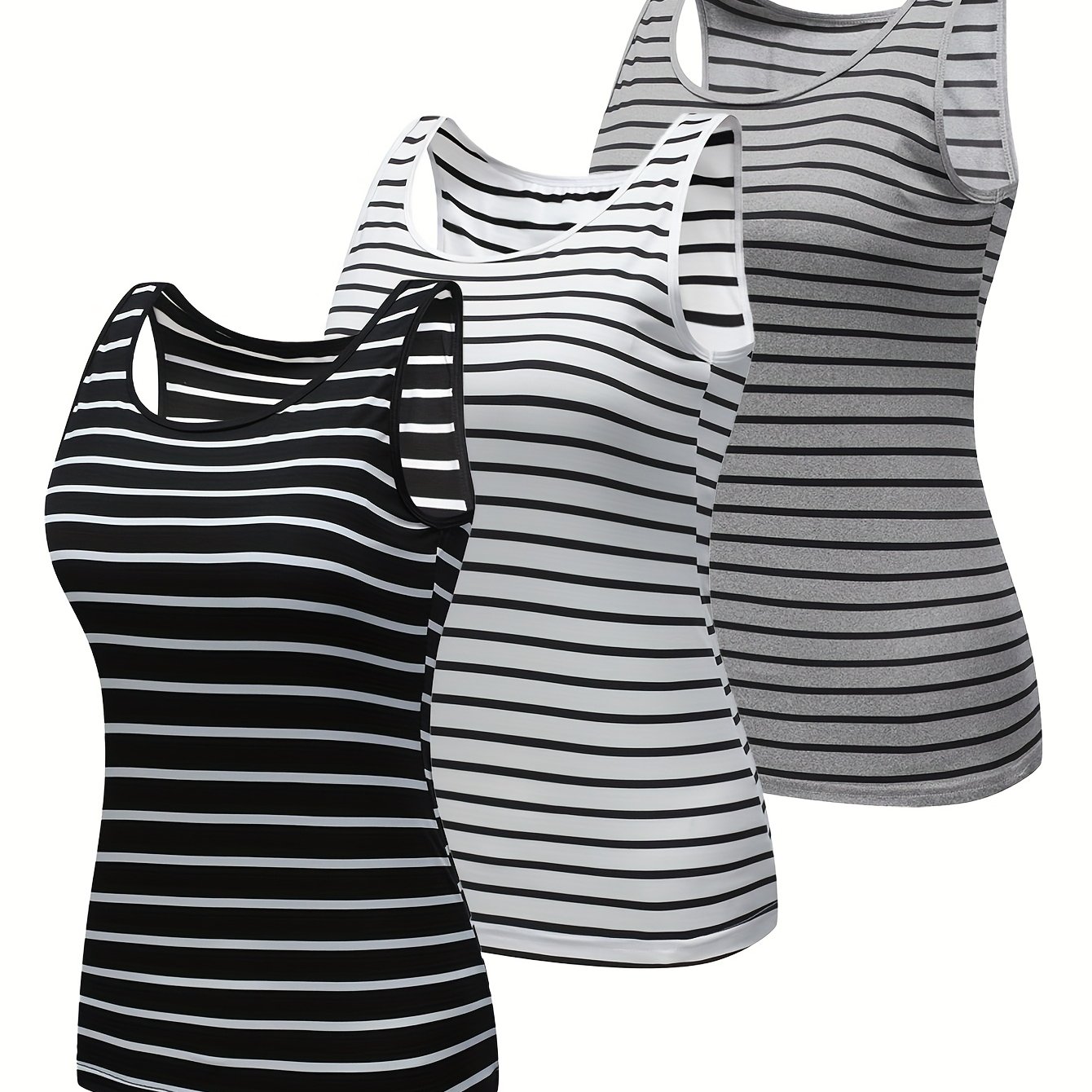 TEMU 스트라이프가 있는 블랙, 화이트, 그레이 여성용 탱크 탑 3종 세트 - 스타일리시한 디자인, 착용감 좋은 원단, 신축성, 편안함, 통기성으로 내부 및 외부 착용에 적합하며 봄/여름 선물로 완벽합니다.