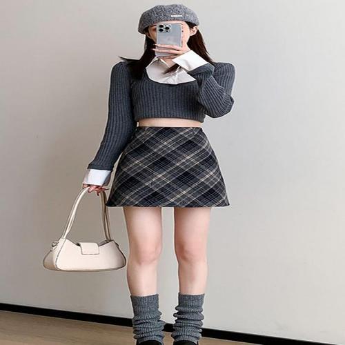 [셀러허브_여성트랜드패션]ONM 가을 겨울 모직 체크 스커트 A라인 미커트 치마