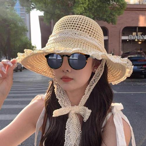 여름 라피아햇 레이스리본 여성용 모자 옥외 WFH76D2