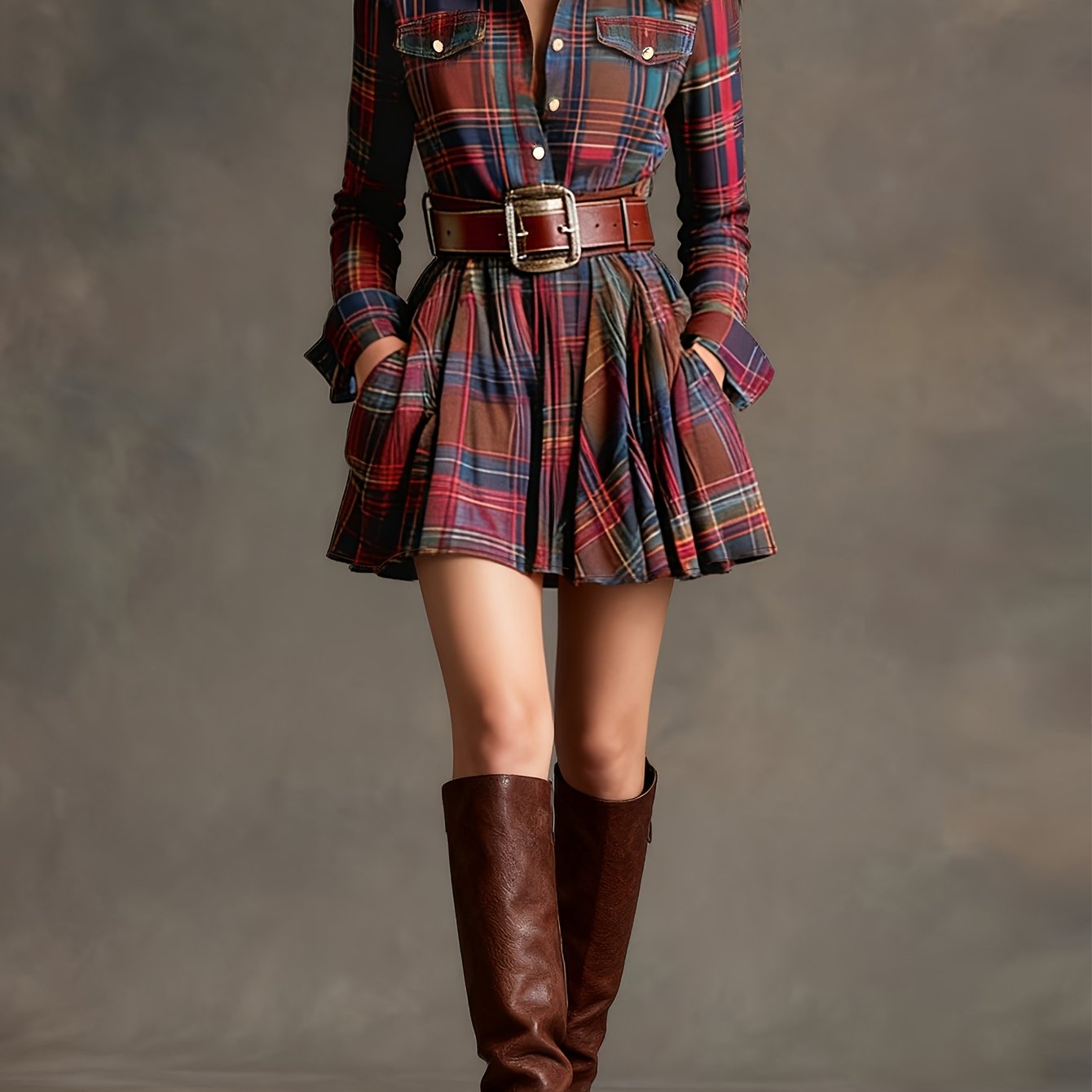TEMU 벨트 미포함 - 봄 여름용 잉글리시 스타일 셔츠 드레스 - 컬러 블록 체크 웨이스트 디자인 단추 포켓 숏 스커트 - 빈티지 캐주얼 슬림핏 숏 셔츠 드레스|여름원피스|셔츠|여름블라우스