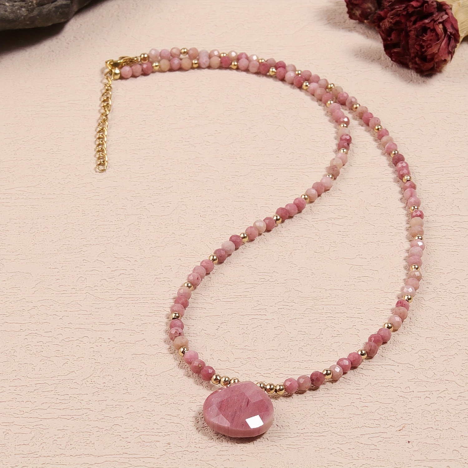 TEMU 1개 천연 로도나이트 스톤 목걸이 - 물방울 펜던트, 핑크 비즈 & 골든 스페이서, 조절 가능한 레이어링 체인 주얼리, 선물, 캐주얼 의상, 사계절 우아한 보호 액세서리 (면처리 보석)