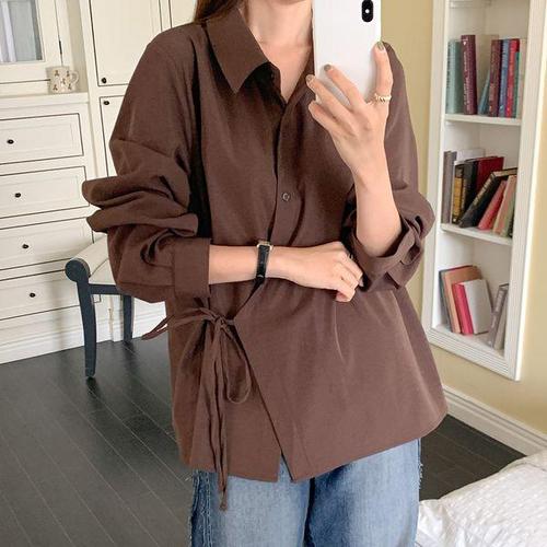 [신상오픈런]여성 루즈핏 언발란스 랩 셔츠 가을 출근 스타일 리본 디테일