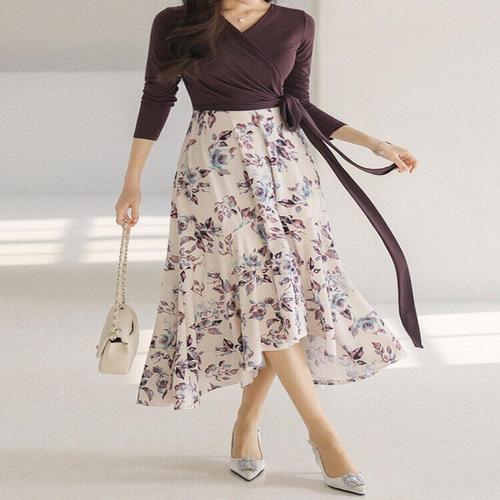 [스타일온미][스타일온미] 로하미 랩 리본 디테일 밑단 플레어 머메이드 라인 배색 원피스