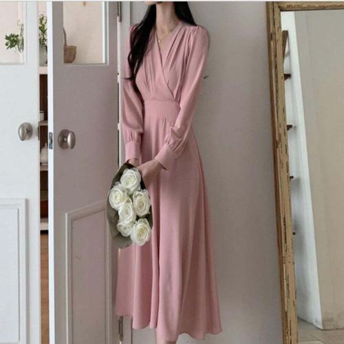 [오너클랜]인기상품 브이넥 랩 스타일 롱원피스 뒷밴딩 출근룩 사무실 하객 정장 드레스 [WFLI1KR_260227]