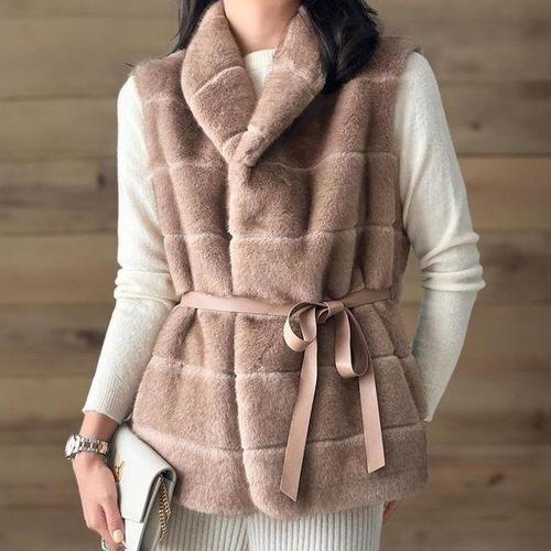 [신상오픈런]여성 파티웨어 연말 스타일 리본 허리띠 스트라이프 인조밍크 조끼