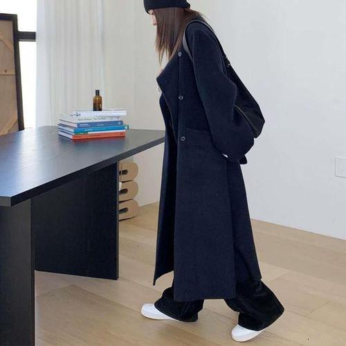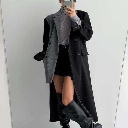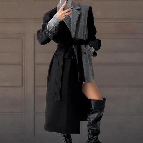 [신상오픈런]여성용 배색 언발란스 누빔 더블버튼 벨트 울 롱코트