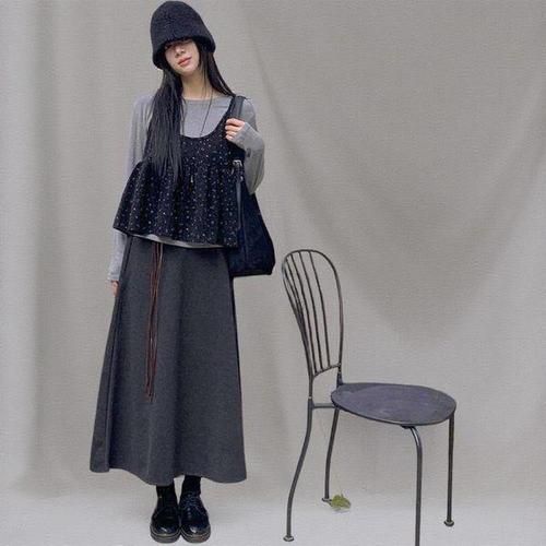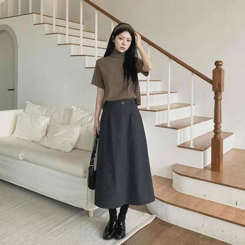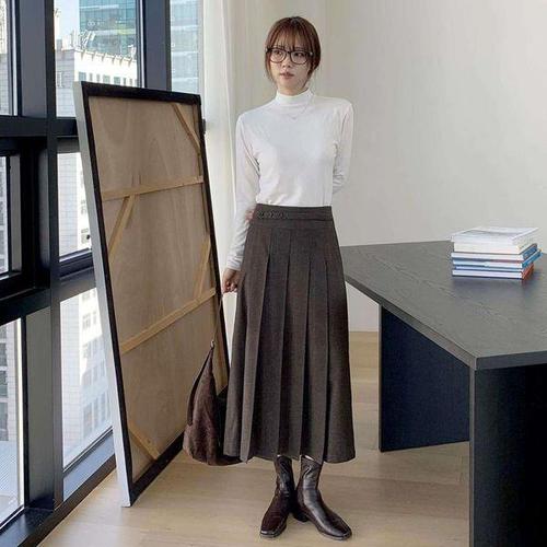 [신상오픈런]여성 롱 스커트 A라인 벨트 세트 뒷밴딩 모직 스커트