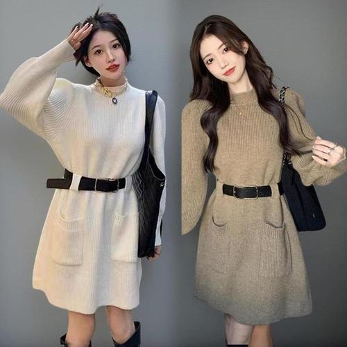 [신상오픈런]여성용 일상 벨트 퍼프 소매 니트 미니 드레스 (44659240)