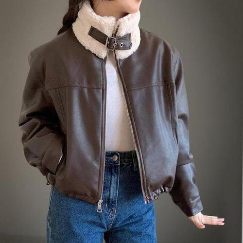[신상오픈런]여성용 클래식 퍼안감 하이넥 버클 가죽 무스탕 재킷
