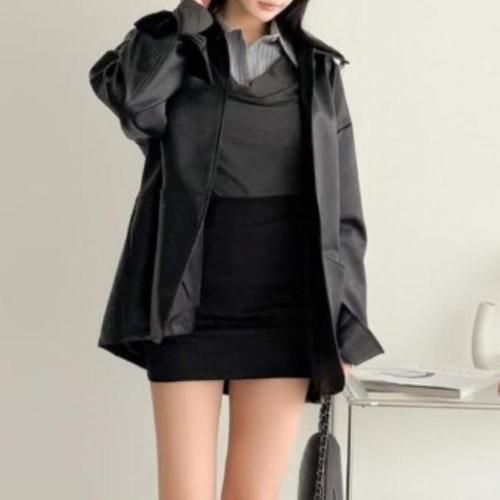[신상오픈런]여성 루즈핏 가죽 자켓 카라넥 힙무드 레더 자켓