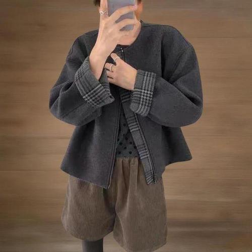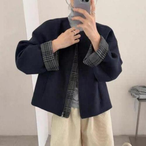 [신상오픈런]여성 체크 패턴 울 혼합 오버사이즈 노카라 집업 재킷
